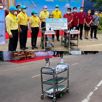 ***นายอาคม จันทร์นาม ผอ.วิทยาลัยเทคนิคร้อยเอ็ด กล่าวว่า วิทยาลัยเทคนิคร้อยเอ็ด จัดการเรียนการสอนสาขาเมคคาทรอนิกส์และหุ่นยนต์ ทั้งคณะครูและนักเรียนร่วมกันผลิตหุ่นยนต์บริการทางการแพทย์ซึ่งเหมาะที่จะใช้ในการบริการต่างๆเช่นการรับส่งอาหารรับส่งยาให้ผู้ป่วย covid เพราะว่าเป็นการรักษาระยะห่างด้วย ตัวนี้จะเป็นตัวต้นแบบ ทางวิทยาลัยได้จัดทำให้กับโรงพยาบาลสนามหลายแห่งในพื้นที่จังหวัดร้อยเอ็ด และวันนี้ก็เป็นโอกาสดีที่ได้มามอบให้กับทางโรงพยาบาลสนามของอำเภอจตุรพักตรพิมาน การใช้งานในระบบจะใช้การควบคุมโดยส่งผ่านระบบการสื่อสาร IOT ที่ควบคุม ขยับซ้าย ขวา บนล่าง เหมือนตัวบังคับเกมส์ไม่ซับซ้อน สมมุติว่าเป็นพยาบาลเป็นคนควบเครื่อง ไปแจกยาตามที่คนป่วยมีการ สื่อสารผ่านกล้องระบบเสียงตอบโต้ระหว่างผู้ส่งและผู้รับ ตอบโจทย์ในเรื่องของการดูแลคนไข้แบบชีวิตใหม่ในรูปแบบปัจจุบันเราต้องรักษาระยะห่าง
