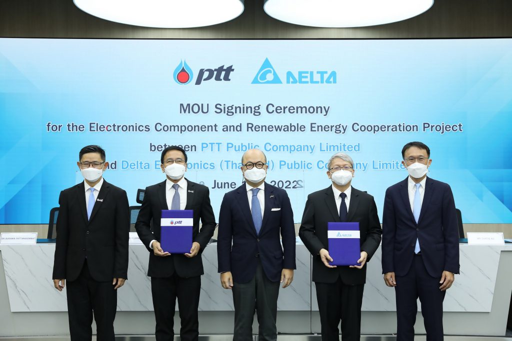หม่อมหลวงชโยทิต กฤดากร ผู้แทนการค้าไทย และที่ปรึกษานายกรัฐมนตรี คุณนพดล ปิ่นสุภา ประธานเจ้าหน้าที่ปฏิบัติการกลุ่มธุรกิจใหม่และโครงสร้างพื้นฐาน บริษัท ปตท. จำกัด (มหาชน) ดร.บุรณิน รัตนสมบัติ รองกรรมการผู้จัดการใหญ่นวัตกรรมและธุรกิจใหม่ บริษัท ปตท. จำกัด (มหาชน) Mr. Jackie Chang, President of Delta Electronics (Thailand) Public Company Limited และ Mr. Curtis Ku, Thailand Country Director of Delta Electronics (Thailand) Public Company Limited ร่วมพิธีลงนามบันทึกข้อตกลงความร่วมมือการศึกษาและแสวงหาโอกาสทางธุรกิจด้านอุปกรณ์อิเล็กทรอนิกส์และพลังงานทดแทน ระหว่าง บริษัท ปตท. จำกัด (มหาชน) และ บริษัท เดลต้า อีเลคโทรนิคส์ (ประเทศไทย) จำกัด (มหาชน) เพื่อผสานความร่วมมือในการศึกษา และพัฒนาธุรกิจในอนาคต ที่มุ่งเน้นด้านอุปกรณ์อิเล็กทรอนิกส์ที่เกี่ยวข้องกับอุตสาหกรรมยานยนต์ไฟฟ้า ระบบนิเวศ อุปกรณ์ และแบตเตอร์รี่สำหรับการชาร์จรถยนต์ไฟฟ้า ที่จะช่วยยกระดับนวัตกรรมอิเล็กทรอนิกส์ให้สามารถเข้าถึง และตอบสนองความต้องการของตลาดและผู้บริโภคได้มากขึ้น ตลอดจนเพิ่มศักยภาพในการใช้พลังงานทดแทนในภาคครัวเรือนและภาคอุตสาหกรรม ซึ่งจะทำให้เกิดโอกาสใหม่ ๆ สำหรับการเติบโตของอุตสาหกรรมอิเล็กทรอนิกส์และเศรษฐกิจดิจิทัล รวมทั้งเร่งการเติบโตของอุตสาหกรรมยานยนต์ไฟฟ้าของไทยให้รวดเร็วยิ่งขึ้น เป็นพลังขับเคลื่อนการพัฒนานวัตกรรมพลังงานยั่งยืนที่พร้อมสำหรับการพัฒนาเศรษฐกิจของประเทศไทย ควบคู่กับการส่งเสริมคุณภาพชีวิตที่ดีให้แก่ชุมชนและสังคมในอนาคต