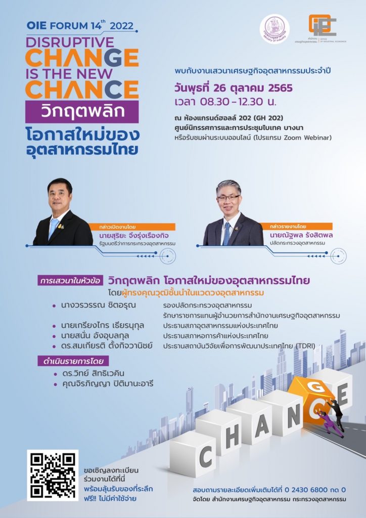 งาน OIE FORUM ครั้งที่ 14 กำหนดจัดขึ้นในวันที่ 26 ตุลาคม 2565 เวลา 08.30 – 12.30 น. ณ ห้องแกรนด์ฮอลล์ 202 (GH 202) ศูนย์นิทรรศการและการประชุมไบเทค บางนา และสามารถรับชม ผ่านช่องทางออนไลน์ ระบบ Zoom Webinar ซึ่งได้รับเกียรติจาก นายสุริยะ จึงรุ่งเรืองกิจ รัฐมนตรีว่าการกระทรวงอุตสาหกรรม เป็นประธานกล่าวเปิดงาน และกล่าวรายงานโดย นายณัฐพล รังสิตพล ปลัดกระทรวงอุตสาหกรรม พร้อมด้วยวิทยากรผู้ทรงคุณวุฒิชั้นนำในแวดวงอุตสาหกรรมไทย อาทิ ผู้อำนวยการสำนักงานเศรษฐกิจอุตสาหกรรม นายเกรียงไกร เธียรนุกุล ประธานสภาอุตสาหกรรมแห่งประเทศไทย นายสนั่น อังอุบลกุล ประธานสภาหอการค้าแห่งประเทศไทย ดร. สมเกียรติ ตั้งกิจวานิชย์ และประธานสถาบันวิจัยเพื่อการพัฒนาประเทศไทย (TDRI) ที่จะมาร่วมเสวนาพิเศษในหัวข้อ “วิกฤตพลิก โอกาสใหม่ของอุตสาหกรรมไทย” ดำเนินรายการโดย ดร. วิทย์ สิทธิเวคิน และ คุณจิรภิญญา ปิติมานะอารี ผู้สนใจสามารถลงทะเบียนเข้าร่วมงานล่วงหน้าได้ที่ http://oieforum.oie.go.th หรือ สแกน QR Code ฟรี ! ไม่มีค่าใช้จ่ายได้ สอบถามรายละเอียดเพิ่มเติม โทร. 0-2430-6800 กด 0