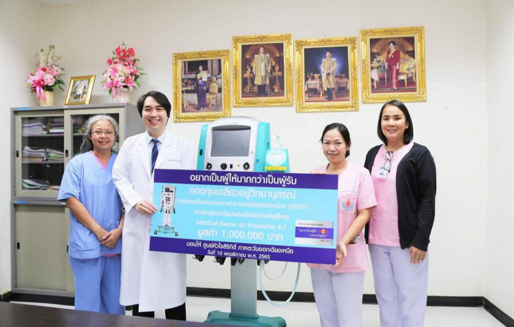 เมื่อวันที่ 10 พย.2565 รศ.นพ.ภัทรพงษ์ มกรเวส ผู้อำนวยการศูนย์หัวใจสิริกิติ์ฯ รับมอบเครื่องทดแทนการทำงานของไตชนิดต่อเนื่อง ( CRRT) สำหรับผู้ป่วยเฉียบพลันตั้งแต่ทารกถึงผู้ใหญ่ มูลค่า 1 ล้านบาท ที่บริจาคในนามกองทุน “เฉลียว อยู่วิทยานุสรณ์” มอบให้ศูนย์หัวใจสิริกิติ์ ภาคตะวันออกเฉียงเหนือ คณะแพทยศาสตร์ มหาวิทยาลัยขอนแก่น นำไปใช้ในการดูแลรักษาผู้ป่วยโรคหัวใจ และผู้ป่วยยากไร้ ซึ่งเป็นปณิธานของกองทุน เฉลียว อยู่วิทยานุสรณ์ ที่ “อยากเป็นผู้ให้ มากกว่าผู้รับ” และเป็นการกำลังใจส่งถึงทีมแพทย์และบุคลากรทางการแพทย์ของศูนย์หัวใจสิริกิติ์ฯ ที่ทุ่มเทการทำหน้าที่ดูแลรักษาผู้ป่วยโรคหัวใจอีกด้วยขอกราบขอบพระคุณมา ณ โอกาสนี้.