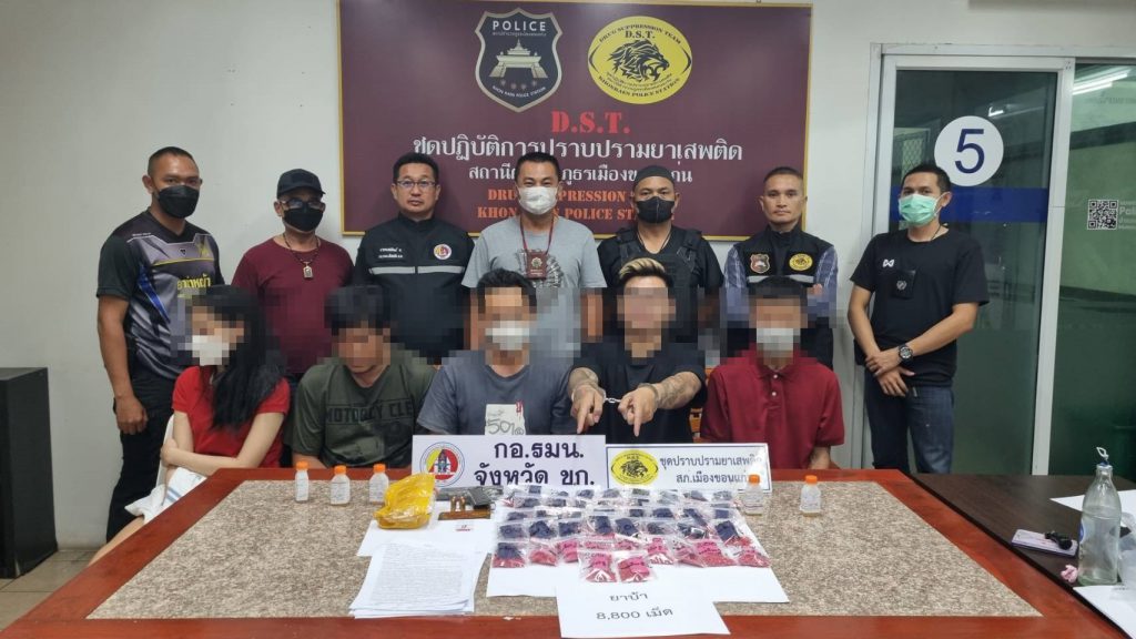 จับกุมผู้ต้องหา 5 ราย1.นายอมรเทพ หรือบาส ป้องขัน อายุ 24 ปี อยู่บ้านเลขที่ 86 หมู่ที่ 19 บ้านผือ ต.พระลับ อ.เมือง จ.ขอนแก่นข้อหา 1. จำหน่ายยาเสพติดให้โทษประเภท 1 เมทแอมเฟตามีน ( ยาบ้า ) โดยการมีไว้เพื่อจำหน่ายและก่อให้เกิดการแพร่กระจายในกลุ่มประชาชนอันเป็นการกระทำเพื่อการค้า มีอาวุธปืนและเครื่องกระสุนปืนไว้ในครอบครองโดยไม่ได้รับอนุญาติ ของกลาง 1.ยาบ้า จำนวน 8,800 เม็ด อาวุธปืนสั้นแบบกึ่งอัตโนมัติ ยี่ห้อKimber จำนวน 1 กระบอ เครื่องกระสุนปืน ขนาด .45 จำนวน 4 ลูกโทรศัพท์มือถือ ยี่ห้อ vivo จำนวน 1 เครื่อง 2.นายกิตติศักดิ์ หรือเติ้ล กิ่งก้าน อายุ 41 ปี อยู่บ้านเลขที่110/26 หมู่ที่ 4 ต.ในเมือง อ.เมือง จ.ขอนแก่น ข้อหา 1.มียาเสพติดให้โทษประเภท 1 เมทแอมเฟตามีน ( ยาบ้า ) ไว้ในความครอบครองเพื่อเสพโดยฝ่าฝืนต่อกฎหมายเสพยาเสพติดให้โทษประเภท 1 เมทแอมเฟตามีน(ยาบ้า) โดยฝ่าฝืนกฎหมาย ของกลาง ยาบ้า จำนวน 5 เม็ด