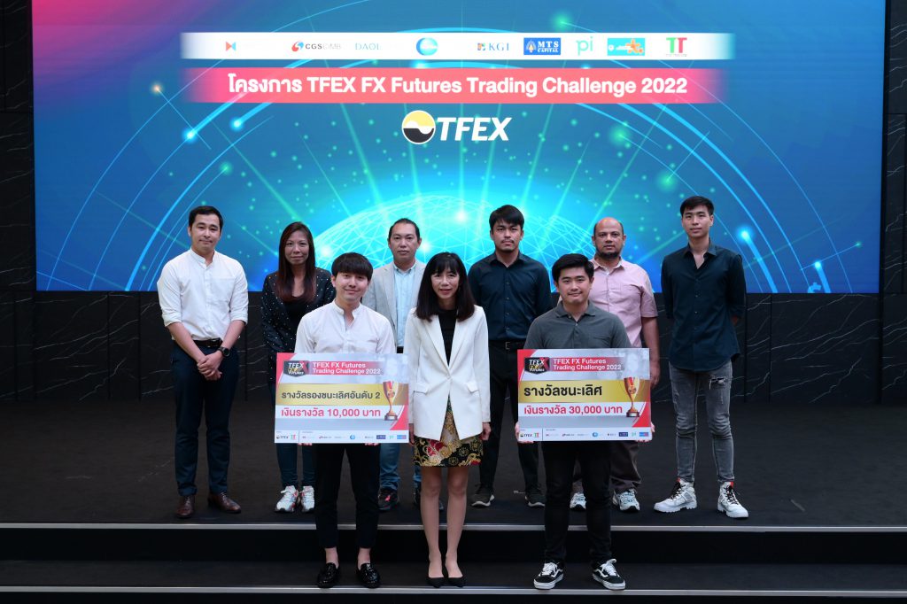 รินใจ ชาครพิพัฒน์ กรรมการผู้จัดการ บมจ. ตลาดสัญญาซื้อขายล่วงหน้า (ประเทศไทย) มอบรางวัลโครงการ TFEX FX Futures Trading Challenge 2022 ซึ่ง TFEX ได้ร่วมกับบริษัทสมาชิก และบริษัท ท๊อปเทรดเดอร์ จำกัด จัดโครงการดังกล่าวขึ้นเพื่อส่งเสริมความรู้ผู้ลงทุนในสินค้า FX Futures ได้แก่ EUR/USD Futures, USD/JPY Futures และ USD Futures ผ่านการอบรมและเวิร์กช็อปเข้มข้น พร้อมสร้างประสบการณ์เทรดผ่านการแข่งขันด้วยพอร์ตจำลอง มีผู้สนใจสมัครเข้าร่วมโครงการ 1,352 คน โดยผู้ชนะเลิศสามารถสร้างอัตราผลตอบแทนได้ถึง 355% สำหรับรองชนะเลิศอันดับ 1 และอันดับ 2 สร้างผลตอบแทนได้ 350% และ 320% ตามลำดับ ติดตามผลการแข่งขันหรือชมสัมมนาย้อนหลังได้ที่ www.TFEX.co.th