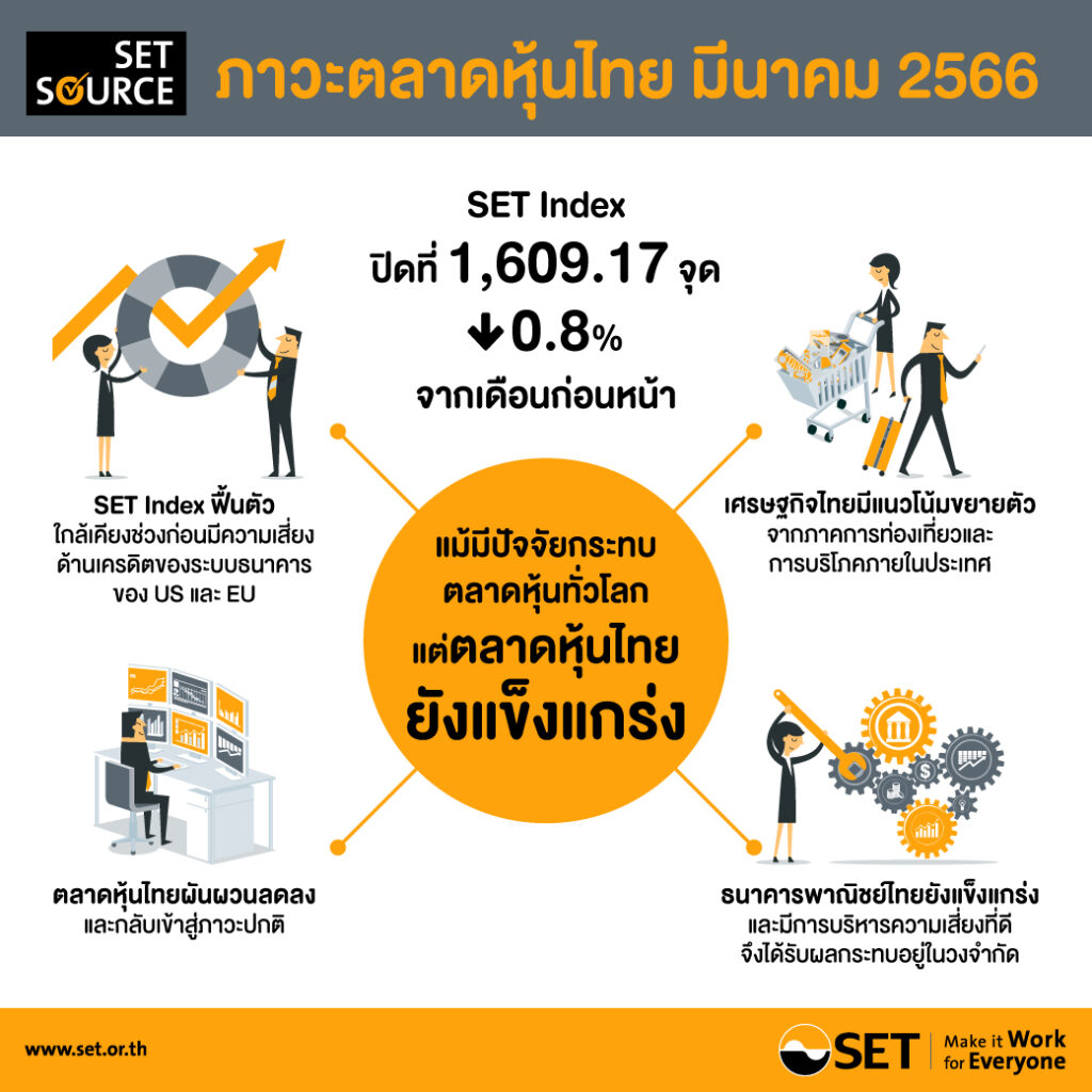 - ณ สิ้นเดือนมีนาคม 2566 SET Index ปิดที่ 1,609.17 จุด ปรับลดลง 0.8% จากเดือนก่อนหน้า โดยปรับไปในทิศทางเดียวกับดัชนีตลาดหลักทรัพย์อื่นใน ASEAN และปรับลดลง 3.6% เมื่อเทียบกับสิ้นปีก่อนหน้า