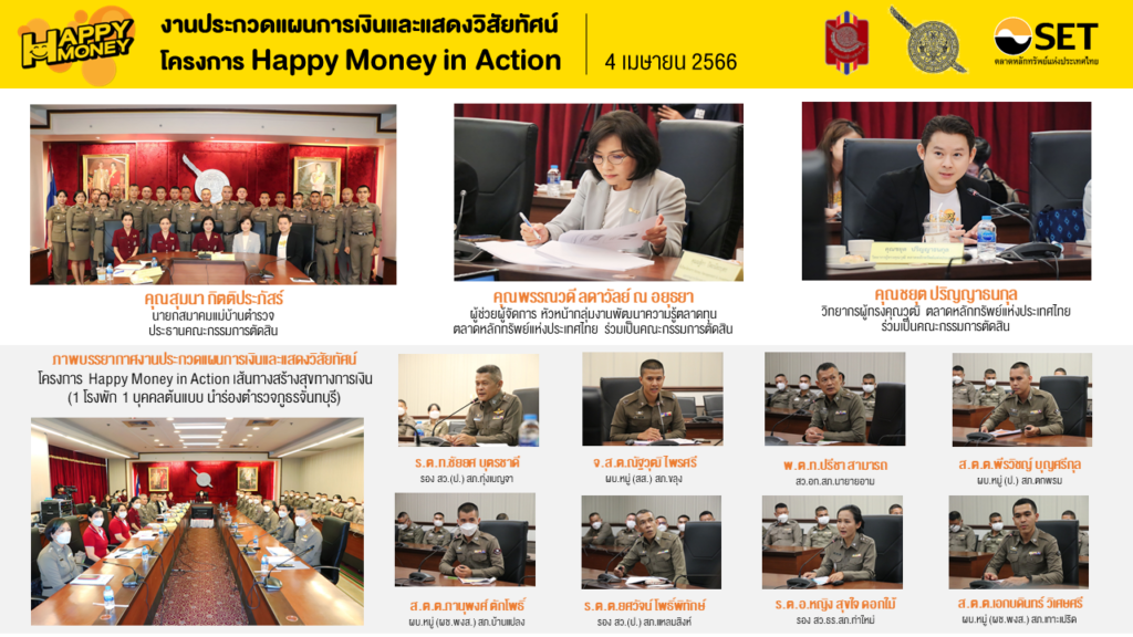 ตลาดหลักทรัพย์แห่งประเทศไทย ร่วมกับ สำนักงานตำรวจแห่งชาติ และสมาคมแม่บ้านตำรวจ จัดประกวดแผนการเงินและแสดงวิสัยทัศน์สำหรับผู้ที่เข้าคัดเลือกเพื่อรับรางวัล “บุคคลต้นแบบ” โครงการ Happy Money in Action เส้นทางสร้างสุขทางการเงิน (1 โรงพัก 1 บุคคลต้นแบบ) นำร่องตำรวจภูธรจันทบุรี จำนวน 8 นาย โดยมี สุมนา กิตติประภัสร์ นายกสมาคมแม่บ้านตำรวจ เป็นประธานคณะกรรมการตัดสิน พร้อมด้วย พรรณวดี ลดาวัลย์ ณ อยุธยา ผู้ช่วยผู้จัดการ หัวหน้ากลุ่มงานพัฒนาความรู้ตลาดทุน ตลาดหลักทรัพย์ฯ และชยุต ปริญญาธนกุล วิทยากรผู้ทรงคุณวุฒิ ตลาดหลักทรัพย์ฯ ร่วมเป็นคณะกรรมการตัดสิน เมื่อ 4 เม.ย. ที่ผ่านมา เพื่อปลูกฝังแนวคิดและทักษะการบริหารเงินและจัดการหนี้สินพร้อมต่อยอดความรู้ผ่านการฝึกปฏิบัติจริง รับคำปรึกษากับวิทยากรเพื่อให้เห็นการเปลี่ยนพฤติกรรมการเงินของข้าราชการตำรวจและบุคคลในครอบครัวให้สามารถบริหารจัดการเงินและหนี้ได้อย่างยั่งยืน สร้างบุคคลต้นแบบ Success Case และต้นกล้าด้านการเงินของ ภ.จว. จันทบุรี สำหรับองค์กรที่สนใจความรู้ด้านการเงินของตลาดหลักทรัพย์ฯ ดูรายละเอียดเพิ่มเติมที่ www.set.or.th/happymone