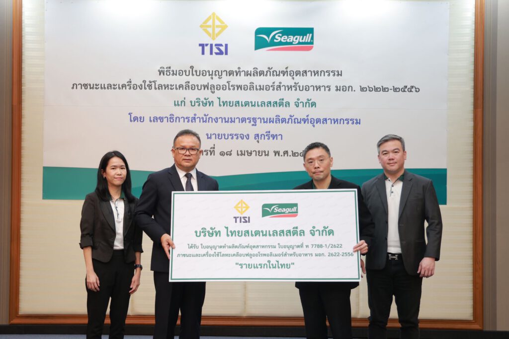 ด้าน นายอรุณ เรืองจรุงพงศ์ ประธานเจ้าหน้าที่ฝ่ายบริหาร บริษัท ไทยสเตนเลสสตีล จำกัด ผู้ผลิตและจัดจำหน่ายเครื่องครัวตราซีกัล (Seagull) เผยว่า มีความภาคภูมิใจอย่างยิ่งที่เครื่องครัวนอนสติ๊กซีกัลได้ผ่านการทดสอบและได้รับใบอนุญาต มอก. รายแรกของไทย  โดยซีกัลเป็นผู้ผลิตและจัดจำหน่ายเครื่องครัวนอนสติ๊ก ที่มีคุณภาพมาตรฐานระดับโลก  ซึ่งเราได้ให้ความสำคัญด้านความปลอดภัยของผู้บริโภคมาเป็นอันดับหนึ่ง ตั้งแต่การออกแบบสินค้า การผลิต รวมถึงบริการหลังการขาย โดยเฉพาะสารเคลือบกันติดที่ทางเราเลือกใช้ ได้ผ่านการรับรองมาตรฐานจากองค์การอาหารและยาประเทศสหรัฐอเมริกา ซึ่งบริษัทผู้ผลิตสารเคลือบกันติดรายใหญ่ที่สุดในโลก อย่างดูปองท์และวิทฟอร์ด ได้เป็นพันธมิตรร่วมกับซีกัลเพื่อเป็นการยืนยันคุณภาพและความปลอดภัยให้กับผู้บริโภค และทำการทดสอบคุณภาพของสารเคลือบกันติดทุกล็อตเพื่อให้มั่นใจว่า สินค้าทุกชิ้นมีคุณภาพได้มาตรฐาน ก่อนส่งถึงมือผู้บริโภค ซึ่งเราอยากให้ผู้บริโภคมั่นใจได้ว่าเครื่องครัวนอนสติ๊กตราซีกัล (Seagull) มีคุณภาพ ได้มาตรฐาน และปลอดภัยต่อผู้บริโภค จึงได้ดำเนินการในการขอใบอนุญาตมาตรฐานผลิตภัณฑ์อุตสาหกรรมภาชนะและเครื่องใช้โลหะเคลือบฟลูออโรพอลิเมอร์สำหรับอาหารและได้รับใบอนุญาตเป็นรายแรก