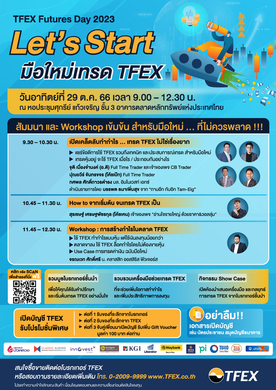 บมจ. ตลาดสัญญาซื้อขายล่วงหน้า (ประเทศไทย) ชวนร่วมงาน “TFEX Futures Day 2023: Let’s Start มือใหม่เทรด TFEX” ชวนมือใหม่เรียนรู้ TFEX หาทางรอดให้พอร์ตช่วงตลาดขาลง อัดแน่นด้วยสัมมนา Workshop และกิจกรรมเข้มข้น เริ่มด้วยหัวข้อ “เปิดเคล็ดลับทำกำไร…เทรด TFEX ไม่ใช่เรื่องยาก” ร่วมแชร์ประสบการณ์และเทคนิคการเทรด TFEX สำหรับมือใหม่ โดย จุติ เนื่องจำนงค์ หรือ อ. ติ เจ้าของเพจ CB Trader ปุณยวีร์ จันทรขจร หรือโค้ชเป๊ก Full Time Trader และทศพล ศักดิ์ถาวรดำรง บล. Innovest X หัวข้อ “How to จากเริ่มต้น จนเทรด TFEX เป็น” แบ่งปันเทคนิคการเทรดให้มือใหม่ โดย สุรเชษฐ์ เศรษฐพัชรกุล หรือโค้ชเคน เจ้าของเพจ “อ่านใจรายใหญ่ ด้วยราคา&วอลลุ่ม” และ “WORKSHOP: การสร้างกำไรในตลาด TFEX” ใช้ TFEX ทำกำไรแบบหุ้นด้วยเงินลงทุนที่น้อยกว่า ตลาดขาลงใช้ TFEX ล็อกกำไรโดยไม่ต้องขายหุ้น และสรุป Use Case การเทรดค่าเงินฉบับมือใหม่ โดย จรณเวท ศักดิ์ศรี บ. คลาสสิก ออสสิริส ฟิวเจอร์ พร้อมกิจกรรม Showcase นำเสนอเครื่องมือและกลยุทธ์การเทรด และโปรโมชันเปิดบัญชีภายในงาน สำหรับผู้ที่ยังไม่มีบัญชี TFEX พบกันอาทิตย์ที่ 29 ต.ค. 66 เวลา 9.00-12.30 น. ชั้น 3 ตลาดหลักทรัพย์ฯ ลงทะเบียนฟรี www.TFEX.co.th สอบถามโทร 0 2009 9999