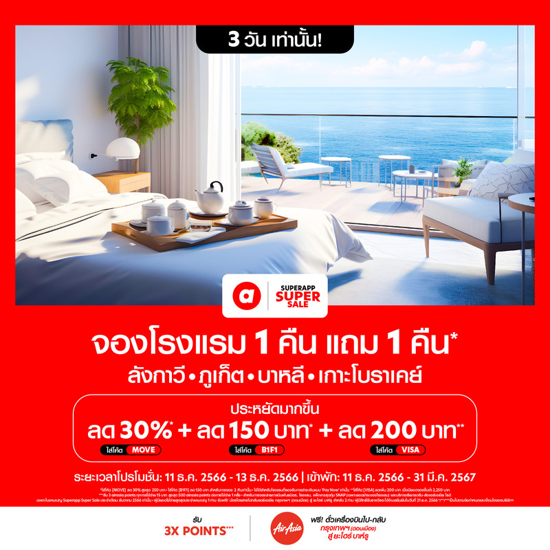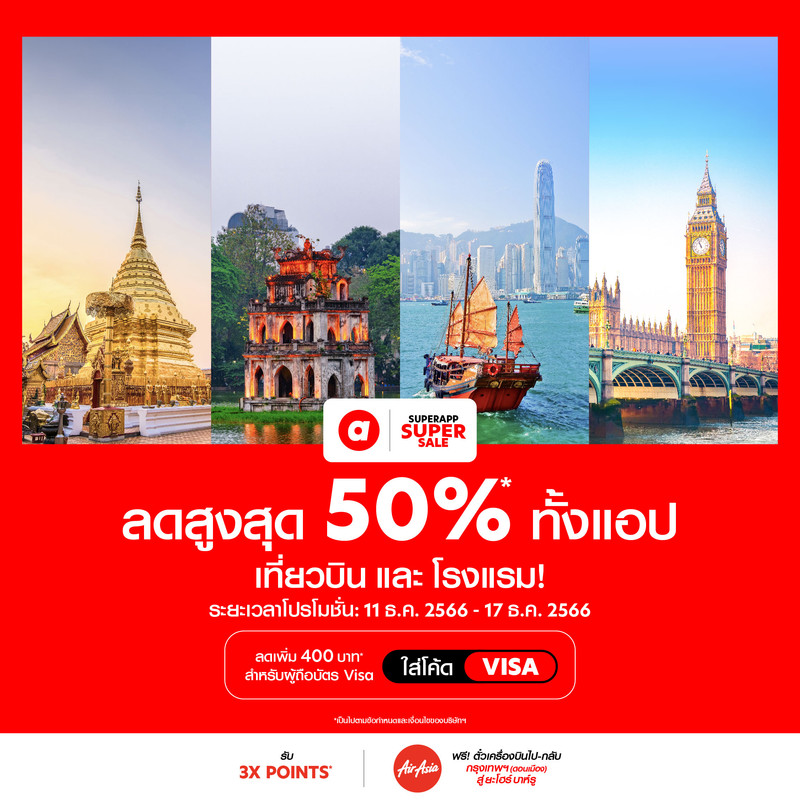 กรุงเทพ 12 ธันวาคม 2566 – airasia Superapp (กำลังจะเปลี่ยนชื่อเป็น airasia MOVE เร็วๆนี้) ซูเปอร์แอปด้านการเดินทางและการท่องเที่ยวครบวงจรชั้นนำในภูมิภาคอาเซียนตั้งแต่การเดินทางทางอากาศจนถึงภาคพื้นดิน แจกดีลใหญ่ประจำเดือนส่งท้ายปี ! ลดทั้งแอปสูงสุด 50%* ไม่ว่าจะเป็นส่วนลดสุดพิเศษทั้งจากสายการบินพันธมิตรชั้นนำมากกว่า 700 สายการบิน โรงแรมที่พักทั่วโลกการันตีราคาถูกสุด แพ็กเกจตั๋วเครื่องบินพร้อมที่พัก บริการเรียกรถรับ-ส่ง จองตั๋วรถโดยสาร รถไฟ เรือเฟอร์รี่ ประสบการณ์จองโต๊ะร้านอร่อย โดยรับ 3 airasia points สำหรับการใช้จ่ายทุก 15 บาท** พร้อมดีลพิเศษ จาก VISA และ ฟรี! บัตรโดยสารแอร์เอเชีย กรุงเทพฯ (ดอนเมือง) สู่ ยะโฮร์ บาห์รู 11 – 17 ธ.ค. 2566 ( สมาชิก airasia ช้อปคุ้มก่อนใคร 24 ชม. 10 ธ.ค. 2566 เริ่ม 10.00 น.)