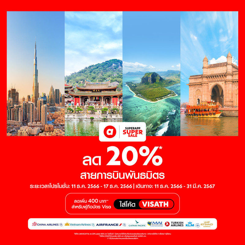 ถูกจริง บินทันที ลด 20%* สายการบินพันธมิตรผ่าน airasia Superapp (ไม่สามารถใช้ได้กับแอร์เอเชียทุกเส้นทาง) กรุงเทพฯ (สุวรรณภูมิ) สู่ฮ่องกง เริ่มต้น 1,648 บ. ฮานอย ย่างกุ้ง เริ่มต้น 2,458 บ ลอนดอน ปารีส เริ่มต้น 13,978 และอื่น ๆ อีกมากมาย เช่น ไทเป โตเกียว ฮาเนดะ ปักกิ่ง นิวยอร์ก เพียงใส่โค้ด: MOVE20TH ลดสูงสุด 400 บาท ไม่มีขั้นต่ำ และ พิเศษ ลดเพิ่ม 400 บ. ขั้นต่ำ 4,000 บาท สำหรับผู้ถือบัตร VISA เพียงใส่โค้ด: VISATH พร้อมดีล พิเศษ จาก สายการบินพันธมิตร มากมาย ได้แก่ Myanmar Airlines ลดสูงสุด 30% กรุงเทพฯ (สุวรรณภูมิ) สู่ย่างกุ้ง 2,150 บาท กรุงเทพฯ (สุวรรณภูมิ) สู่ มัณฑะเลย์ 1,470 บาท ภูเก็ต สู่ ย่างกุ้ง 1,765 บาท T’Way airline ลดสูงสุด 10% จาก กรุงเทพฯ (สุวรรณภูมิ) สู่ ช็องจู 2,430 บาท และ ดีลเด็ดตั๋วไป-กลับจาก Lao Airlines ลดสูงสุด 20% กรุงเทพฯ (สุวรรณภูมิ) สู่ เวียงจันทน์ , กรุงเทพฯ (สุวรรณภูมิ) สู่ หลวงพระบาง 6,585 บาท
