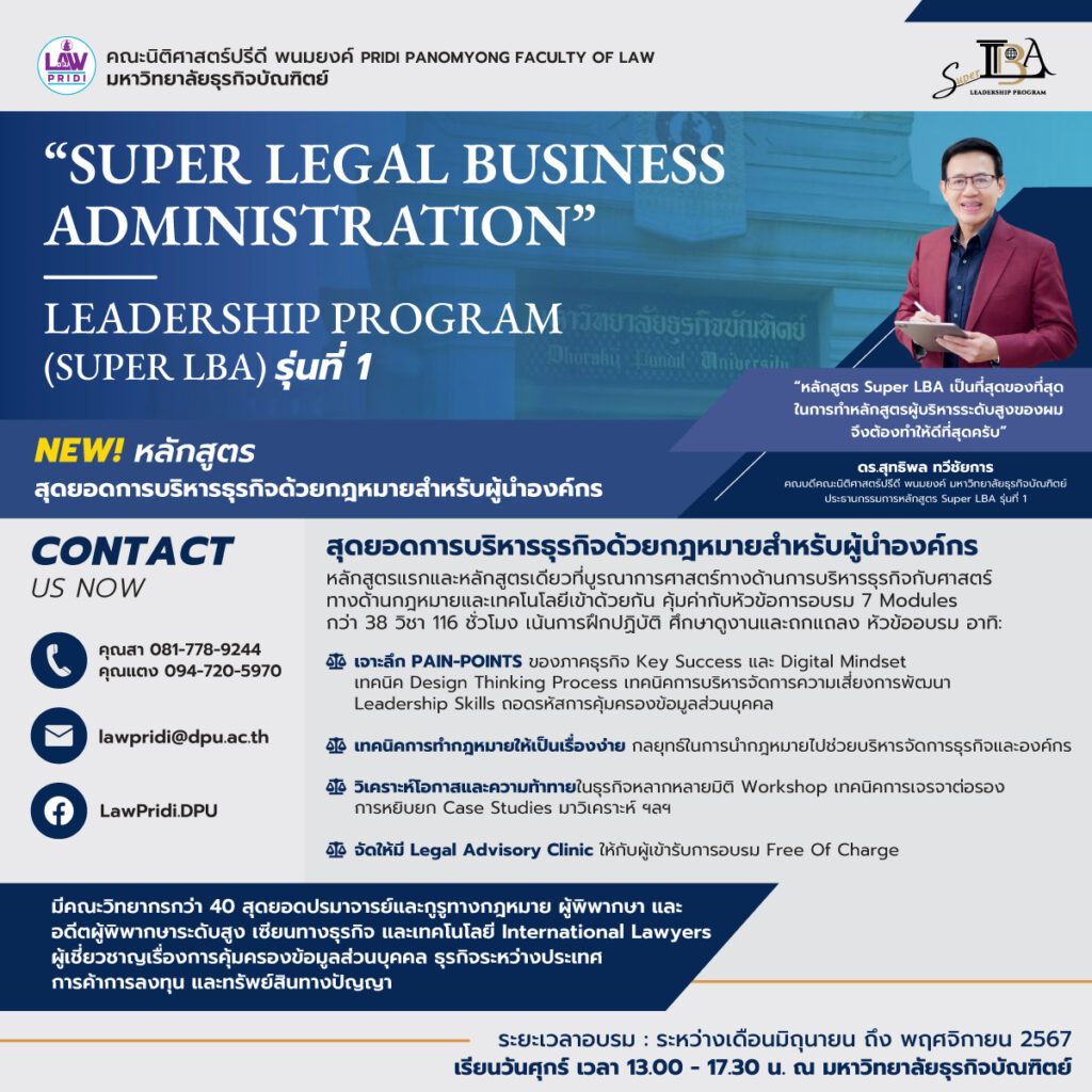 คณะนิติศาสตร์ปรีดี พนมยงค์ มหาวิทยาลัยธุรกิจบัณฑิตย์ (DPU) เปิดอบรมหลักสูตร “สุดยอดการบริหารธุรกิจด้วยกฎหมายสำหรับผู้นำองค์กร” หรือ Super LBA รุ่นที่ 1 ระหว่างมิถุนายน-พฤศจิกายน 2567