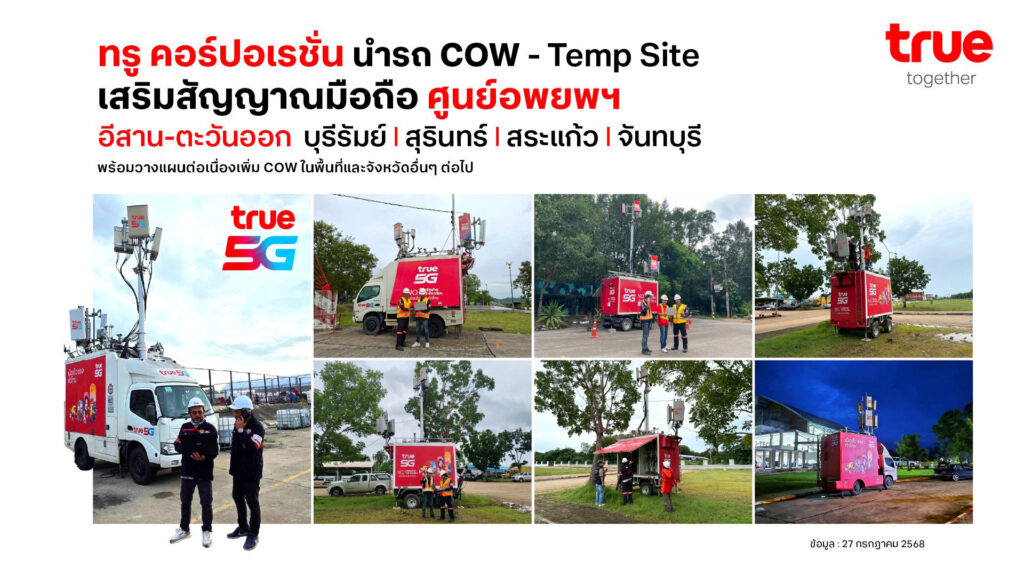 27 กรกฎาคม 2568 – บมจ. ทรู คอร์ปอเรชั่นห่วงใยประชาชนที่ได้รับผลกระทบจากสถานการณ์การปะทะพื้นที่ชายแดนไทย–กัมพูชา เร่งจัดทัพรถโมบายล์สถานีฐานเคลื่อนที่เร็ว (Cell-On-Wheel: COW) และเสาสัญญาณเฉพาะกิจ (Temporary Site) เข้าไปเสริมสัญญาณมือถือ 5G/4G เพื่อรองรับการใช้งานทั้งการโทรและอินเทอร์เน็ตในศูนย์อพยพต่างๆ และพร้อมใช้งานแล้ว เช่น ที่จังหวัดบุรีรัมย์ สุรินทร์ สระแก้ว และจันทบุรี พร้อมทั้งติดตั้งเสาสัญญาณเฉพาะกิจ (Temporary Site) ที่ ศรีสะเกษ และกำลังจะนำ COW ไปติดตั้งเพิ่ม และวางแผนเพิ่มสัญญาณตามสถานการณ์ในพื้นที่หรือจังหวัดอื่นๆ ต่อไป