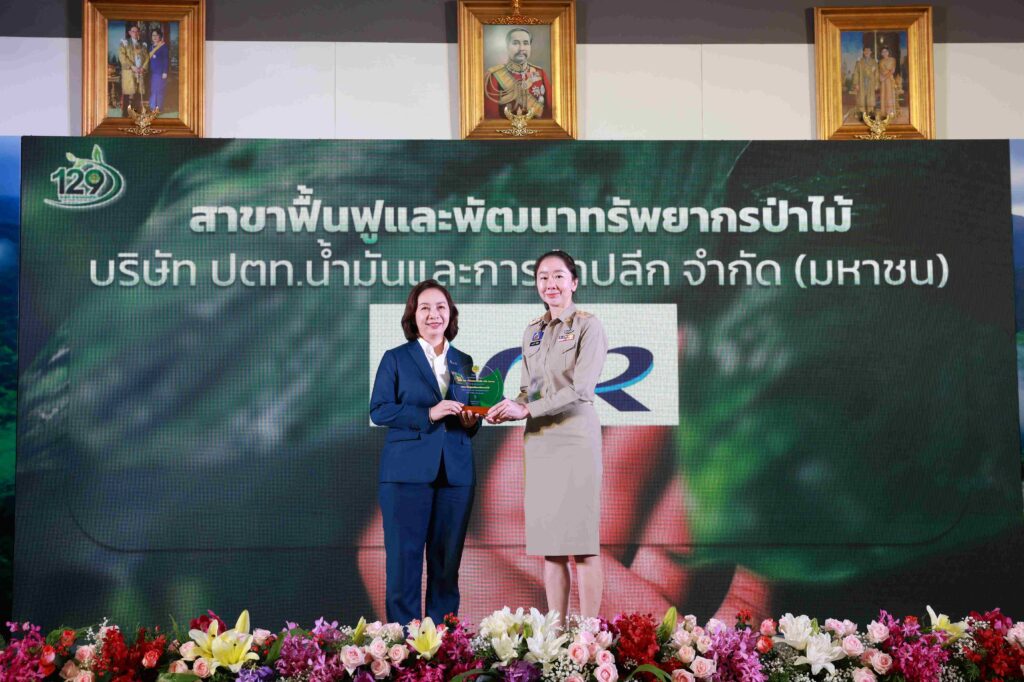 นางสาววรรณวิสาข์ สู่ศุภอรรถ ผู้จัดการฝ่ายบริหารความยั่งยืน และคุณภาพ ความปลอดภัย อาชีวอนามัย และสิ่งแวดล้อม บริษัท ปตท. น้ำมันและการค้าปลีก จำกัด (มหาชน) (OR) เป็นผู้แทนรับโล่รางวัลผู้ช่วยเหลือราชการกรมป่าไม้ ในสาขาการฟื้นฟูและพัฒนาทรัพยากรป่าไม้ เนื่องในโอกาสวันสถาปนากรมป่าไม้ ครบรอบ 129 ปี จาก ดร.ชญานันท์ ภักดีจิตต์ ปลัดกระทรวงทรัพยากรธรรมชาติและสิ่งแวดล้อม (ทส.) เป็นประธานในพิธี ณ กรมป่าไม้