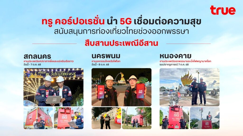 2 ตุลาคม 2568 – ทรู คอร์ปอเรชั่นเตรียมความพร้อมด้านเครือข่าย 5G และ 4G รองรับนักท่องเที่ยวทั้งไทยและต่างชาติที่เดินทางเข้าสู่ภาคอีสานในช่วงเทศกาลประเพณีสำคัญ 3 งานใหญ่ ได้แก่ งานประเพณีแห่ปราสาทผึ้งและแข่งขันเรือยาว จังหวัดสกลนคร, งานมหกรรมไหลเรือไฟโลก จังหวัดนครพนม และงานประเพณีออกพรรษาและบั้งไฟพญานาคโลก จังหวัดหนองคาย โดยจัดเต็มโซลูชันทั้งเพิ่มรถโมบายล์สถานีฐานเคลื่อนที่เร็ว หรือ COW, เสาสัญญาณชั่วคราว, การปรับแต่งสัญญาณตามพฤติกรรมการใช้งาน, จัดทีมวิศวกรประจำพื้นที่งาน, เสริมสัญญาณบนเส้นทางคมนาคมและแหล่งท่องเที่ยว พร้อมศูนย์ปฏิบัติการเครือข่ายอัจฉริยะ (BNIC) ที่นำ AI ดูแลตลอด 24 ชั่วโมง เพื่อให้นักท่องเที่ยวได้สัมผัสประสบการณ์การเชื่อมต่อดิจิทัลต่อเนื่องและมีประสิทธิภาพตลอดการเข้าร่วมงานประเพณีอันทรงคุณค่าของชาวอีสาน พร้อมบูธกิจกรรมพิเศษภายในงานที่จังหวัดนครพนมและหนองคายเพื่อรองรับนักท่องเที่ยว รวมทั้งลูกค้าทรูและดีแทค ด้วยความสนุกและข้อเสนอพิเศษอีกด้วย