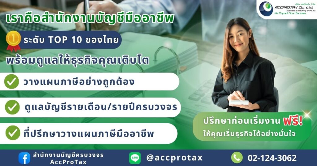 AccProTax เป็นสำนักงานบัญชีที่ให้บริการด้านบัญชี ยื่นภาษีประจำเดือน วางแผนภาษี และจดทะเบียนธุรกิจแบบครบวงจร ด้วยประสบการณ์ยาวนานกว่า 25 ปี ภายใต้แนวคิด “เข้าใจก่อนทำ” เพื่อให้ผู้ประกอบการสามารถวางแผนภาษีได้ถูกต้องตั้งแต่เริ่มต้นก้าวแรกของธุรกิจ ไปสู่ความสำเร็จอย่างมั่นคง ทีมงานประกอบด้วยนักบัญชี และที่ปรึกษาภาษีมืออาชีพ ที่มีประสบการณ์จริง พร้อมให้คำแนะนำฟรีก่อนเริ่มงาน และมีการรายงานผลประกอบการให้กิจการต่างๆ ทุกเดือน ดูแลอย่างใกล้ชิด เพื่อช่วยให้ธุรกิจของคุณเติบโตอย่างยั่งยืน มั่นคง และโปร่งใส สอบถามข้อมูลเพิ่มเติมได้ที่ เว็บไซต์: www.accprotax.com หมายเลขโทรศัพท์: 02 124 3062 หรือ Line Official: @accprotax