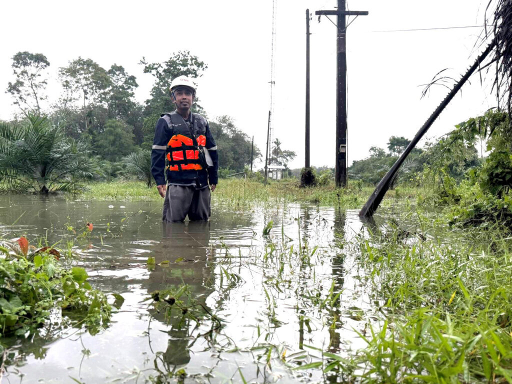 บรรยายภาพ: เจ้าหน้าที่ทีมเน็ตเวิร์กทรูเข้าตรวจสอบสถานีฐานในพื้นที่น้ำท่วม อ.ทุ่งสง จ.นครศรีธรรมราช เพื่อซ่อมสายไฟเบอร์ที่เป็นเส้นหลักสำหรับเชื่อมจากเสาสัญญาณไปยังโครงข่ายใหญ่ของจังหวัด เพื่อประชาชนใช้งานมือถือและเน็ตบ้านได้ต่อเนื่องตามปกติแม้อยู่ในสถานการณ์น้ำท่วมหนักหลายพื้นที่