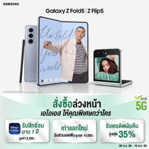 AIS 5G ยินดีต้อนพับ กับสุดยอดสมาร์ทโฟนแห่งปี Galaxy Z Flip5 และ Galaxy Z Fold5 ให้ลูกค้าใช้งานบนโครงข่าย 5G ที่ใหญ่ที่สุดในไทย พร้อมข้อเสนอและสิทธิพิเศษสุดปัง