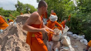 พระสงฆ์ขอนแก่นและชาวบ้านช่วยกันบรรจุทรายใส่กระสอบเพื่อปิดทางน้ำ และซ่อมพนังกั้นน้ำชี ป้องกันน้ำท่วมเขตเมืองขอนแก่น