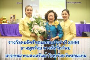 ขอนแก่น/นางยุพรัตน์ ดวงดีทวีทรัพย์ นายกสมาคมส่งเสริมผ้าไทยจังหวัดขอนแก่นเข้ารับมอบรางวัลคนดีศรีขอนแก่นประจำปี 2566