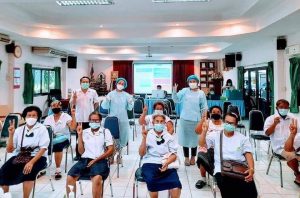 น่ารักมุ้งมิ้ง คุณตา-คุณยาย กลุ่มเสี่ยง 608 สวมชุดนักเรียนนั่งรถโรงเรียนเข้ารับการฉีดวัคซีนโควิด-19 ด้วยหน้าตาที่ยิ้มแย่มแจ่มใส