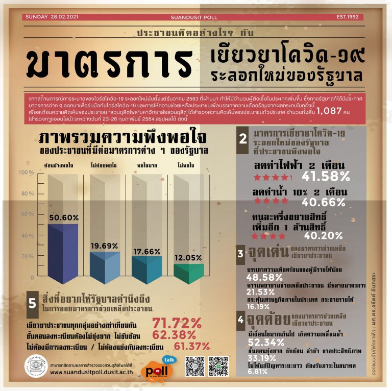 แฟนเพจสวนดุสิตโพล มหาวิทยาลัยสวนดุสิต สำรวจความคิดเห็นของประชาชนเรื่อง “มาตรการเยียวยาโควิด-19 ระลอกใหม่ของรัฐบาล” จำนวน 1,087 คน สำรวจวันที่ 23 – 26 กุมภาพันธ์ 2564 พบว่า มาตรการที่ประชาชนพึงพอใจมากที่สุด คือ การลดค่าไฟฟ้า 2 เดือน จุดเด่นของมาตรการเยียวยา คือ ช่วยบรรเทาความเดือดร้อนของผู้มีรายได้น้อย จุดด้อย คือ มีเงื่อนไขมากเกินไป เกิดความเหลื่อมล้ำ สิ่งที่รัฐบาลควรคำนึงถึงในการออกมาตรการ คือ ต้