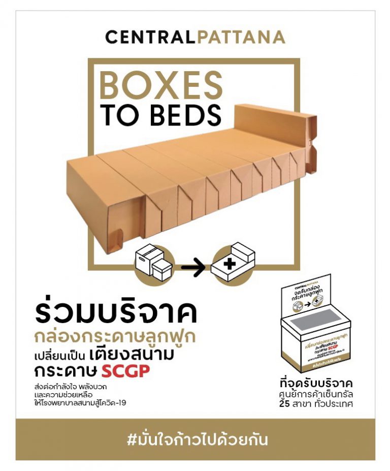 เซ็นทรัลพัฒนา รวมพลังคนไทยเปลี่ยนกล่องกระดาษเป็นเตียงสนามกระดาษเอสซีจีพี ที่จุดบริจาค ณ ศูนย์การค้าเซ็นทรัล 25 สาขาทั่วประเทศ ตั้งเป้าร่วมเฉพาะกิจ 14 วัน 400 ตัน