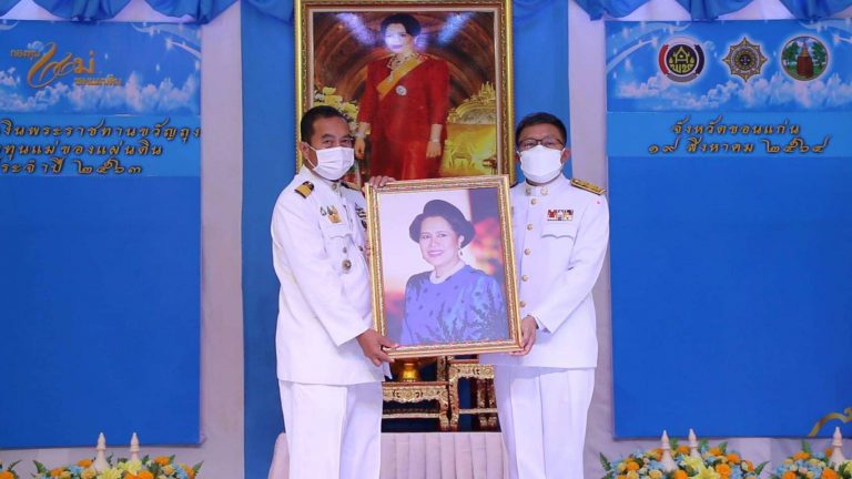 ขอนแก่นรับมอบเงินพระราชทานกองทุนแม่ของแผ่นดินรวม 39 กองทุนสำหรับการนำไปใช้ในการป้องกันยาเสพติดและสร้างความเข้มแข็งให้กับคนในชุมชน เมื่อเวลา 10.30 น. วันที่ 19 ส.ค.2564 ที่ห้องประชุมยอดขวัญเทศบาลเมืองศิลา ต.ศิลา อ.เมือง จ.ขอนแก่น นายสมศักดิ์ จังตระกุล ผวจ.ขอนแก่น เป็นประธานพิธีมอบเงินพระราชทานขวัญถุงกองแม่ของแผ่นดิน ประจำปี 2563 ต่อหน้าสมเด็จพระนางเจ้าสิริกิติ์ พระบรมราชินีนาถ พระบรมราชชนนีพันปี