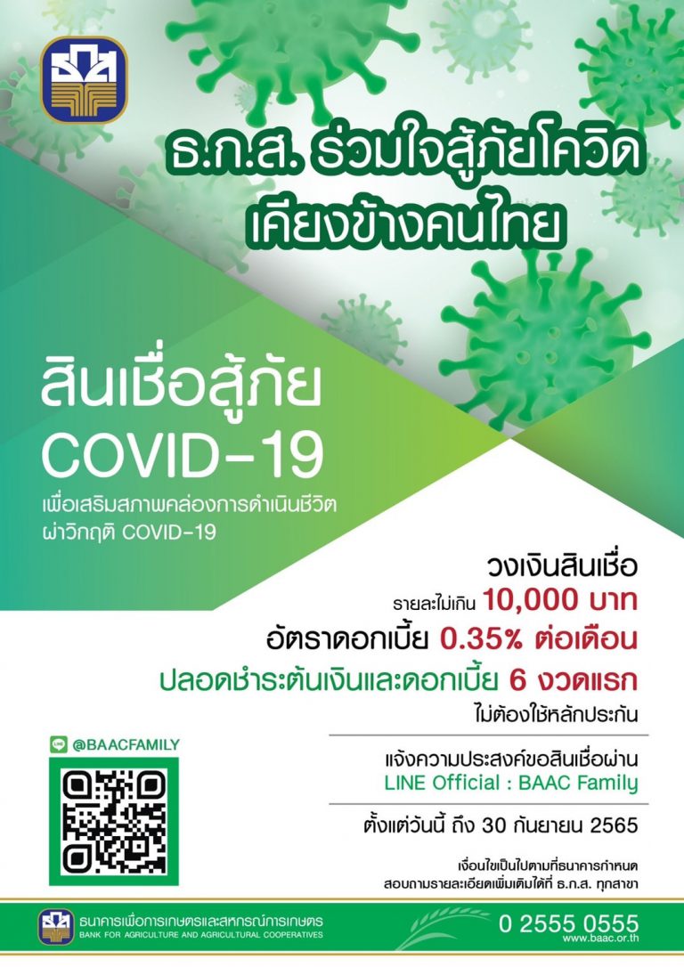 ธ.ก.ส. ขยายระยะเวลาขอสินเชื่อสู้ภัย COVID – 19 เพื่อเพิ่มสภาพคล่องและป้องกันการก่อหนี้นอกระบบให้กับเกษตรกรรายย่อยและลูกจ้างภาคการเกษตร รายละไม่เกิน 10,000 บาท โดยไม่ต้องใช้หลักประกัน อัตราดอกเบี้ยคงที่ร้อยละ 0.35 ต่อเดือน ส่งชำระคืน 3 ปี ปลอดชำระต้นเงินและดอกเบี้ยในช่วง 6 เดือนแรก วงเงินรวม 10,000 ล้านบาท และเพื่อลดผลกระทบจากการแพร่เชื้อ ผู้ที่สนใจสามารถแจ้งความประสงค์ผ่าน LINE Official BAAC Famil