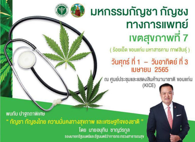 ขอนแก่นจัดการประชุมวิชาการกัญชากัญชงทางการแพทย์ เขตสุขภาพที่ 7 วันที่ 1-3 เมษายน 2565 ณ ศูนย์ประชุมและแสดงสินค้านานาชาติขอนแก่น Kice ในงานพบกับปาฐากถาพิเศษเรื่องกัญชากัญชงไทยความมั่นคงทางสุขภาพและเศรษฐกิจของชาติ โดย นายอนุทิน ชาญวีรกูล รองนายกรัฐมนตรีและรัฐมนตรีว่าการกระทรวงสาธารณสุข เวทีวิชาการกัญชาทางการแพทย์แผนปัจจุบัน ประเด็นความก้าวหน้าทางการวิจัยล่าสุดในการนำกัญชามาบำบัดโรค ประสบการณ์ในการใ