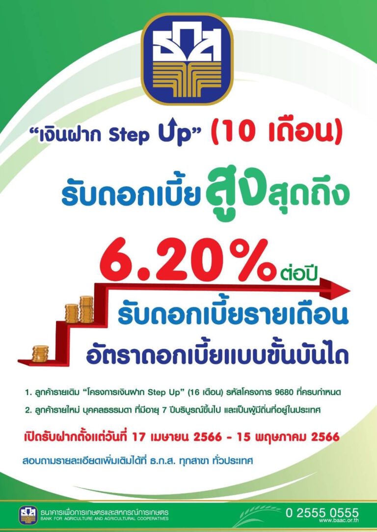 รับลมร้อน ..ธ.ก.ส. เปิดรับ “เงินฝาก Step Up” ดอกเบี้ยสูงสุด 6.20% ต่อปี ไม่จำกัดวงเงินรับฝากสูงสุด