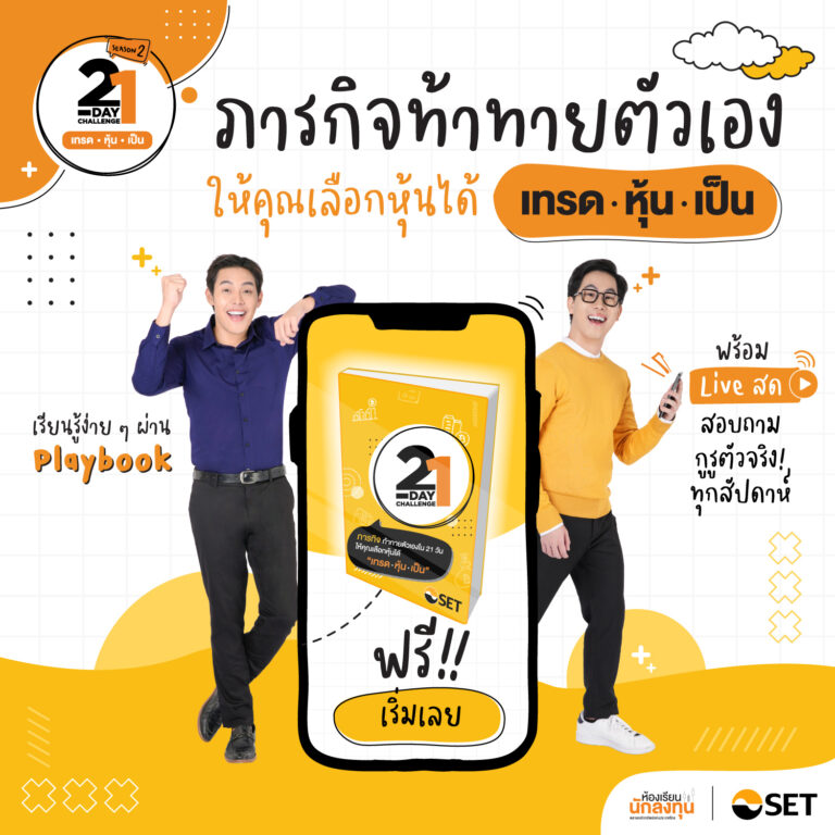 ตลาดหลักทรัพย์แห่งประเทศไทย ชวนผู้สนใจร่วมทำภารกิจท้าทายตัวเอง “เลือกหุ้นได้ เทรด หุ้น เป็น” เพื่อเสริมสร้างนิสัยการลงทุนที่ดี กับแคมเปญ “21-Day Challenge” Season 2 เรียนรู้ง่าย ๆ ผ่าน Playbook พร้อมรับชม Live สอบถามข้อสงสัยกับกูรูตัวจริงได้ทุกสัปดาห์ วันเสาร์ที่ 8, 15 และ 22 ก.ค. 2566 โดยเริ่มสัปดาห์ที่ 1 กับหลักสูตรรู้เรื่องหุ้น เริ่มต้นอย่างมั่นใจด้วย เนื้อหาพื้นฐานการลงทุน ครบ จบทุกประเด็น ต่อ
