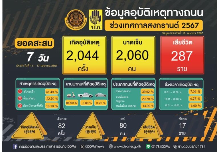 ศปถ. สรุปผลการดำเนินงานป้องกันและลดอุบัติเหตุทางถนนสงกรานต์ 67 เกิดอุบัติเหตุรวม 2,044 ครั้ง ผู้บาดเจ็บรวม 2,060 คน ผู้เสียชีวิต รวม 287