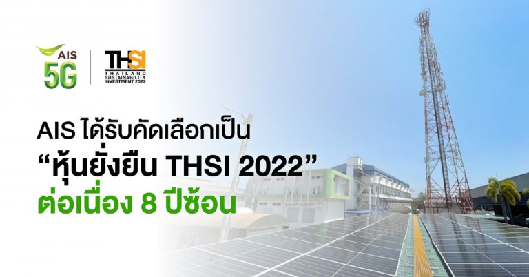 AIS ได้รับคัดเลือกเป็น “หุ้นยั่งยืน THSI 2022” ต่อเนื่อง 8 ปีซ้อนจาก ตลาดหลักทรัพย์แห่งประเทศไทย สะท้อนวิถีการดำเนินธุรกิจอย่างยั่งยืน มุ่งสร้างการเติบโตร่วมกันของ เศรษฐกิจ สังคม และสิ่งแวดล้อม ในโลกดิจิทัล